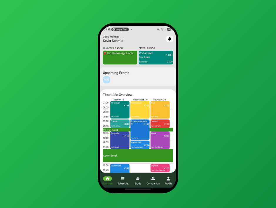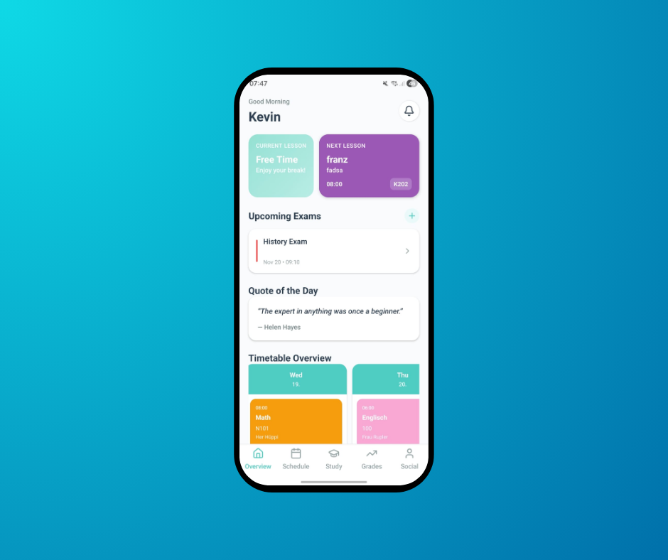 Begleit-App für Kantischüler mit Stundenplan, Noten-Tracking und organisatorischen Tools.